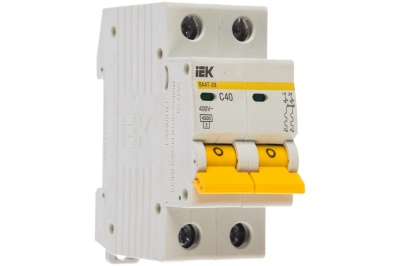 Автоматический выключатель ВА47-29 2Р 40А 4,5кА х-ка С ИЭК MVA20-2-040-CnАвтоматические выключатели ВА47-29 предназначены для защиты распределительных и групповых цепей, имеющих различную нагрузку:n– электроприборы, освещение – выключатели с характеристикой В,n– двигатели с небольшими пусковыми токами (компрессор, вентилятор) – выключатели с характеристикой C,n– двигатели с большими пусковыми токами (подъемные механизмы, насосы) – выключатели с характеристикой D.nАвтоматические выключатели ВА47-29 рекомендуются к применению в вводно-распределительных устройствах для жилых и общественных зданий.nДва типа защиты от перегрузки и короткого замыкания.nПолный комплект дополнительных устройств с возможностью простой самостоятельной установки:n– контакт состояния КС47;n– контакт состояния КСВ47;n– расцепитель минимального напряжения РММ47;n– расцепитель независимый РН47.nУсовершенствованная дугогасительная система: увеличенный срок службы, повышенная устойчивость к токам короткого замыкания.nВозможность одновременного присоединения шиной FORK и гибким проводником для распределения питания цепи через верхние зажимы, а также возможность соединения шиной PIN.nНаличие индикатора положения контактов.nШирокий диапазон рабочих температур от -40 до +50 °С.nНовый эргономичный дизайн рукоятки включения/выключения.nНасечки на контактных зажимах снижают тепловые потери и увеличивают механическую устойчивость соединения.