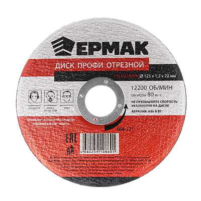 Диск отрезной ЕРМАК ПРОФИ 125×1,2×22,23 мм. Профессиональная серия. Быстрый и чистый рез металла. Скорость до 12250 об/мин. Вес 0,034 кг.