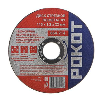 Диск отрезной РОКОТ 115×1,2×22,23 мм. Для резки металла. Скорость до 13300 об/мин. Вес 0,029 кг.