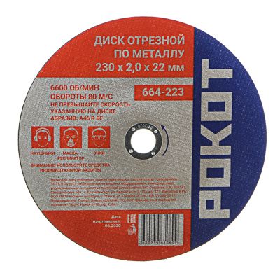 Диск отрезной РОКОТ 230×2,0×22,23 мм. Для резки металла. Скорость до 6650 об/мин. Вес 0,180 кг.