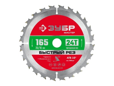 Диск пильный ЗУБР 165×20/16 мм 24T быстрый рез. Для циркулярных пил. Быстрый рез по дереву. Вес 0,493 кг.