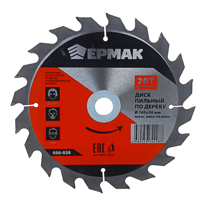 Диск пильный ЕРМАК 165×30×20Т Быстрый рез. Для быстрого пиления древесины. 20 зубьев. Посадка 30-20-16 мм. Вес 0,248 кг.