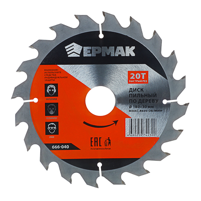 Диск пильный ЕРМАК 180×30×20Т Быстрый рез. Для циркулярных пил. 20 зубьев, быстрый рез по дереву. Посадка 30-20-16 мм. Вес 0,287 кг.