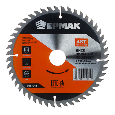 Диск пильный ЕРМАК 190×30×48Т Чистый рез. Для чистового пиления фанеры, МДФ, ламината. 48 зубьев, чистый срез. Вес 0,36 кг.