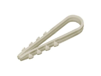 Дюбель-хомут – два в одном! Предназначен он для монтажа кабелей, гофры и труб. Состоит целиком и полностью из пластика. Механизм работы таков: дюбель вбивается в стену, а в него забивается гвоздь для фиксации дюбеля в стене. И всё! Хомут готов к своей основной функции – скреплять вышеупомянутые изделия.