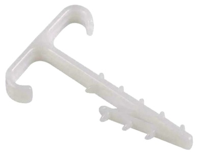 Изделие имеет Т-образную форму и предназначено для крепления двух кабелей. Дюбель-хомут изготовлен из полипропилена, благодаря чему отличается прочностью и рассчитано на высокие нагрузки.