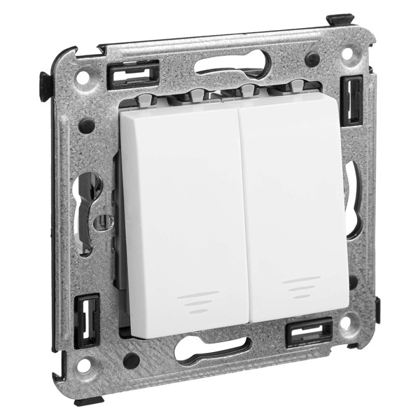 Кнопка двухклавишная. Назначение: для монтажа в подрозеточные коробки глубиной не менее 45 мм . Используется в качестве кратковременного включения источника питания энергией. Фиксация в подрозеточные коробки при помощи каркаса с лапками и саморезов.