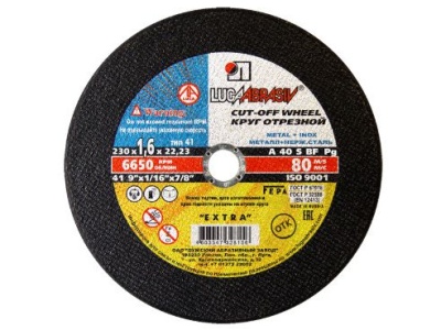 Круг отрезной LUGA 230×1,6×22,23 мм. Тип 41, армированный бакелит. Зернистость A40, твёрдость S. Для резки металла и нержавейки. Скорость до 6650 об/мин. Вес 0,163 кг.