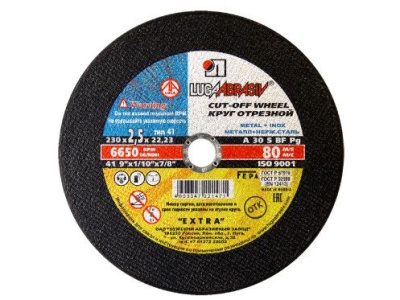 Круг отрезной LUGA 230×2,5×22,23 мм. Тип 41, армированный бакелит. Зернистость A30, твёрдость S. Для резки металла. Скорость до 6650 об/мин. Вес 0,210 кг.