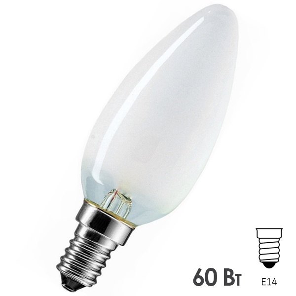 Лампа накаливания OSRAM формы свеча 60Вт. Матовая колба, цоколь Е14. Лицензиатом торговой марки OSRAM в общем освещении является компания LEDVANCE.