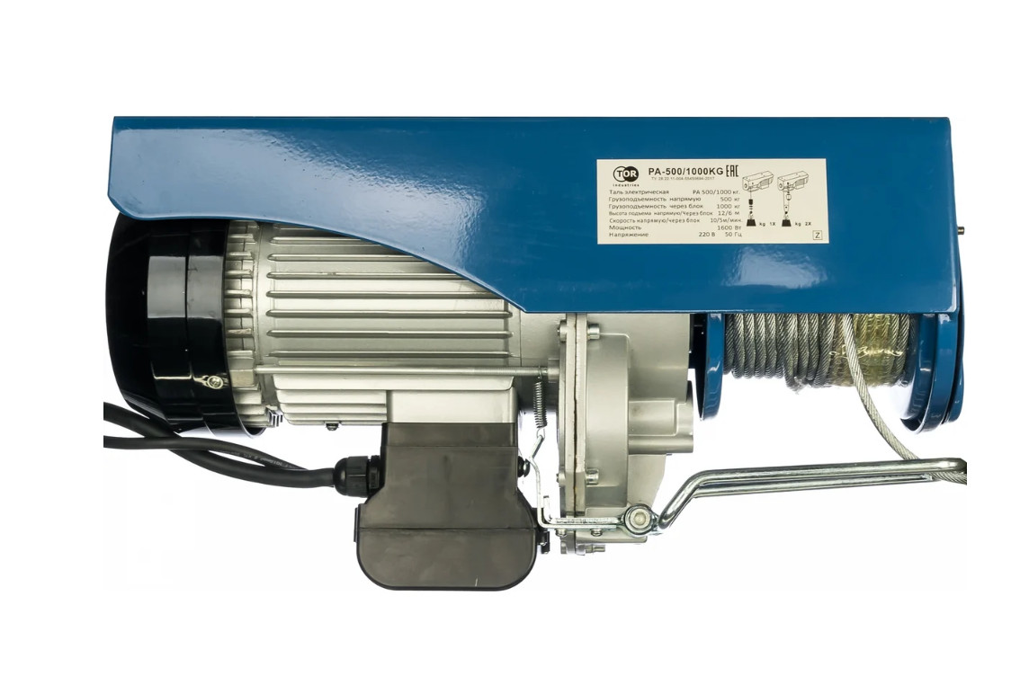 Электрическая таль TOR РА 110100 обладает высокой грузоподъемностью, что позволяет применять ее в сфере промышленности и строительства. Статичное приспособление оборудовано двигателем мощностью 1600 Вт и осуществляет вертикальный подъем груза на высоту 12 метров (вес до 500 кг) или 6 метров (вес до 1000 кг). Модель не предназначена для усиленной эксплуатации. Дина провода пульта - 1.5 м.