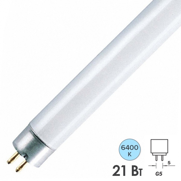 Двухцокольная лампа-трубка люминесцентная ЛЛ Т5 мощностью 21 Вт с цоколем G5 холодного света для ЭПРА 604477