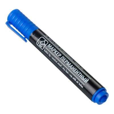 Маркер перманентный синий с пулевидным наконечником. Ширина линии 3 мм. Для надписей на любых поверхностях.