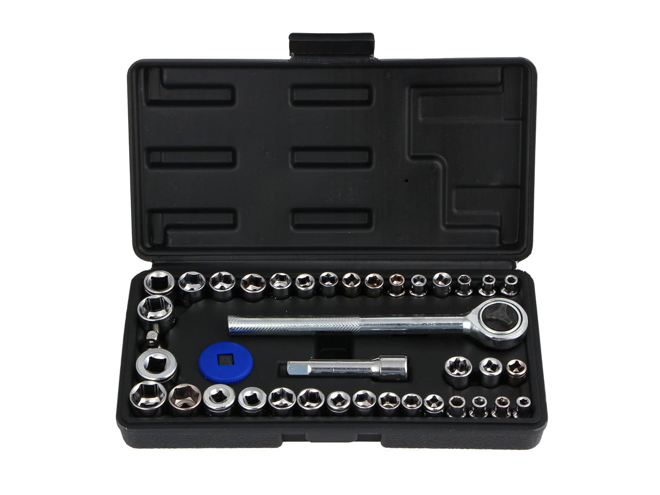 Набор инструментов в кейсе. Включает трещотку 3/8", головки шестигранные 1/4" (14 шт), головки 1/4" дюймовые (14 шт), головки восьмигранные, головки 3/8", удлинитель, переходник, диск. Хромованадиевая сталь. Характеристики: количество: 40 предметов | бренд: РОКОТ | вес: 1,0 кг | размер упаковки: 25x13x5 см