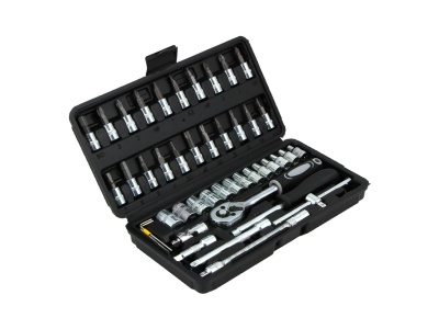 Набор инструментов в пластиковом кейсе. Включает 46 предметов: торцевые головки 1/4", трещотку, вороток, отвертку, удлинители, кардан, отверточные головки, переходник, шестигранные ключи. Углеродистая сталь. Характеристики: количество: 46 предметов | бренд: Ergosystem | вес: 1,1 кг | размер упаковки: 24x13x5 см