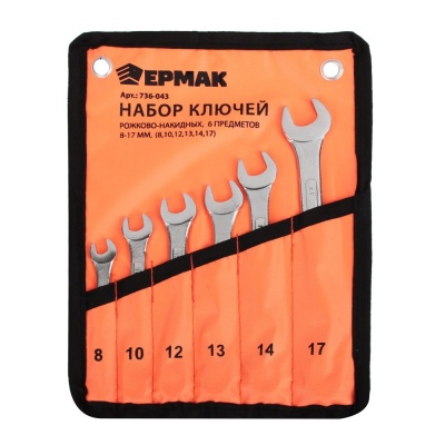 Комплект усиленных комбинированных ключей с рожковой и накидной частью. Размеры: 8, 10, 12, 13, 14, 17 мм. Хромоникелевое покрытие, твердость 45HRc. Удобная сумка из ПВХ для хранения. Характеристики: размеры: 8-17 мм | количество: 6 шт | материал: хромованадиевая сталь | бренд: ЕРМАК | вес: 0,5 кг | размер упаковки: 27,9x7,7x5,4 см