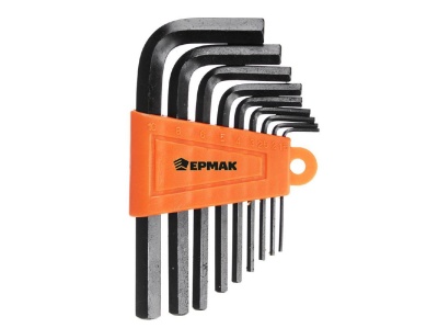 Комплект Г-образных шестигранных ключей наиболее популярных размеров. Подходят для работы с винтами и болтами, имеющими внутренний шестигранник. Удобное хранение в пластиковом держателе. Характеристики: размеры: 1,5-10 мм | количество: 9 шт | бренд: ЕРМАК | материал: углеродистая сталь | вес: 0,259 кг | размер упаковки: 21,6х11,4х1,7 см