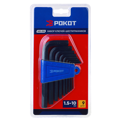 Базовый набор Г-образных шестигранных ключей для работы с крепежом. Наиболее ходовые размеры в пластиковом держателе. Характеристики: размеры: 1,5-10 мм | количество: 9 шт | бренд: РОКОТ | страна: Китай