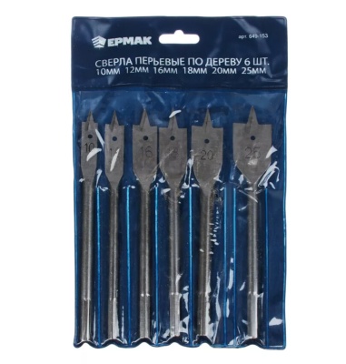 Набор перьевых сверл 6 предметов (10-25мм) Ермак – набор перьевых сверл по дереву. Диаметры: 10, 12, 16, 18, 20, 25 мм. Шестигранный хвостовик. Для быстрого сверления в древесине, ДСП, МДФ.