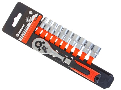 Компактный набор торцевых головок с трещоткой. Посадочный квадрат 1/4". Включает трещотку с прорезиненной ручкой и набор головок. Хромванадиевая сталь. Характеристики: количество: 11 предметов | привод: 1/4" | бренд: ЕРМАК | вес: 0,36 кг | размер упаковки: 26,9x8x4 см