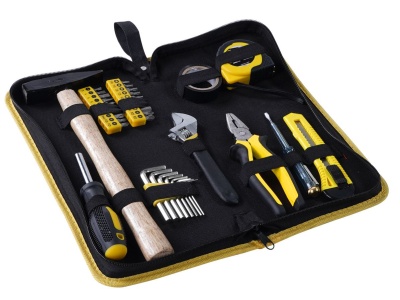 Компактный набор инструментов в сумке-кейсе. Включает 36 предметов: биты 25мм (20 шт), разводной ключ, пассатижи, рукоятку для бит, шестигранные ключи 1,5-8 мм, отвертку индикаторную, молоток, рулетку 3м, нож, изоленту. Характеристики: количество: 36 предметов | бренд: Kolner | вес: 1,6 кг | размер упаковки: 33x16x5 см