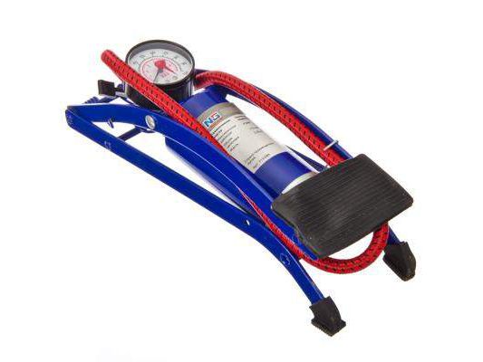 Ножной насос для накачки шин со встроенным манометром. Корпус синего цвета. Модель "Стандарт", размер 55x120 мм.