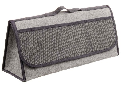 Ковролиновый органайзер NEW GALAXY серого цвета. Размеры 50х25х15 см. Три сетчатых кармана, ручка для переноски, крепление на липучке. Подходит для хранения инструмента в багажнике автомобиля.