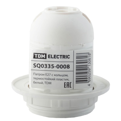 Патрон с кольцом Е27, белый TDM SQ0335-0008 предназначен для фиксации лампы и подведения ее к электросети. Патрон служит в качестве комплектующей детали к светильнику. Корпус изделия выполнен из термостойкого пластика, который идеально подходит для эксплуатации в температурном диапазоне от -100 °С до +260 °С. Патрон подходит для больших статических и динамических нагрузок, большого трения и излучения.
