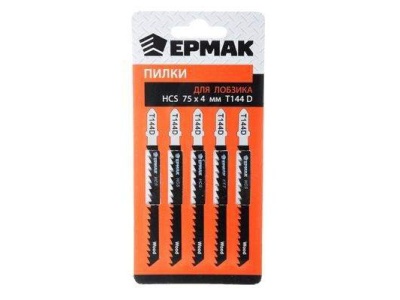 Пилки для электролобзика ЕРМАК HCS, размер 75×4 мм, тип T-144D. Для быстрого грубого пропила древесины. Шаг зубьев 4 мм. Углеродистая сталь. 5 штук.