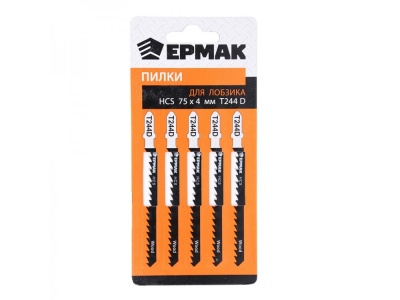 Пилки для электролобзика ЕРМАК HCS, размер 75×4 мм, тип T-244D. Предназначены для быстрого и фигурного реза древесины. Углеродистая сталь, острые зубья. 5 штук в упаковке.