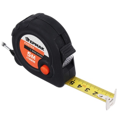 Рулетка 5 м, лента 19 мм. ЕРМАК Черная, 3 фиксатора. Ударопрочный корпус из АБС пластика. Защитное покрытие ленты, ремешок для переноски. Для дома и стройки.