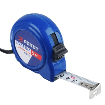 Рулетка 5 м, ширина 19 мм. РОКОТ пластик. Пластиковый корпус, ограничитель, яркая шкала с крупными цифрами. Металлический держатель для хранения.