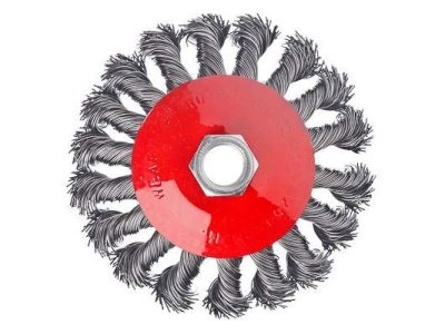 Изготовлена из стальной крученой проволоки. Такая щетка имеет высокую износостойкость и применяется при грубых зачистных работах по металлическим поверхностям, удалении окалины, ржавчины и заусенцев, сглаживании сварных швов.