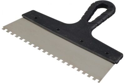Шпатель малярный зубчатый 250мм зуб 10*10. Применяется для равномерного нанесения на различные поверхности клеевых растворов, иных отделочных материалов и их последующего разравнивания с образованием борозд. Профилированное полотно шпателя изготовлено из нержавеющей стали. Пластмассовая рукоятка надежно скреплена с полотном и оснащена отверстием для подвески.