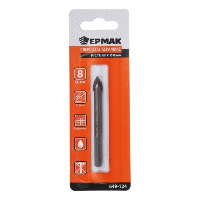 Сверло по керамике и стеклу ЕРМАК 8мм – копьевидное сверло с твердосплавным наконечником. Диаметр 8 мм. Для сверления отверстий в кафеле, керамической плитке и стекле. Аккуратное сверление без сколов.