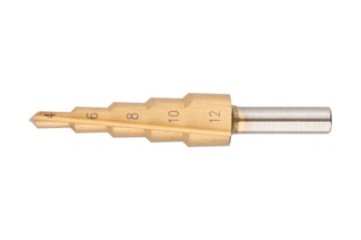 Сверло по металлу HSS ступенчатое 4-12мм – ступенчатое сверло MOS 36381М из быстрорежущей стали. Диапазон 4-12 мм, 5 ступеней. TiN покрытие. Для сверления листового металла и пластика.