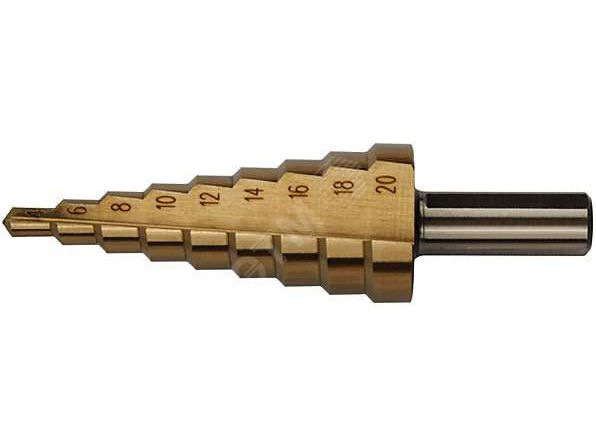 Сверло по металлу HSS ступенчатое 4-20мм 36402 – ступенчатое сверло из полированной быстрорежущей стали. Диапазон 4-20 мм. Лазерная заточка. Для сверления больших отверстий в тонких листовых материалах.