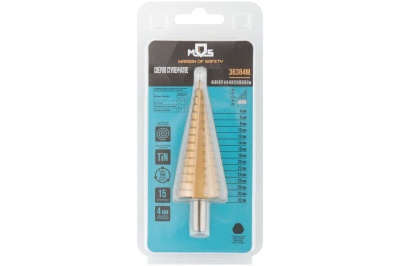 Сверло по металлу HSS ступенчатое 4-32мм – ступенчатое сверло MOS 36384М с 15 ступенями. Диапазон 4-32 мм. Быстрорежущая сталь с нитрид-титановым покрытием. Для сверления и рассверливания отверстий в листовых материалах.