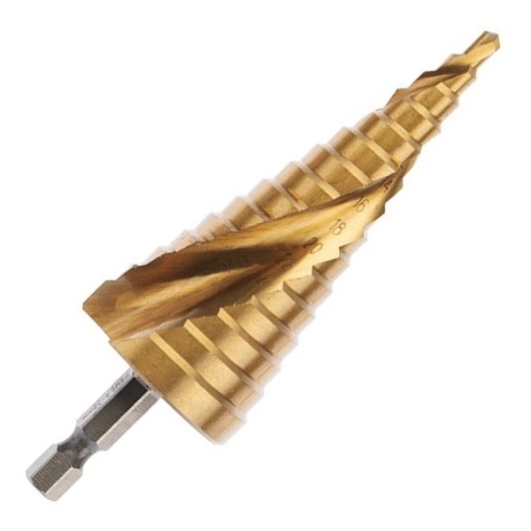 Ступенчатое сверло предназначено для получения отверстий различного диаметра без перестановки режущего инструмента. Применяется в работе с такими материалами, как пластик, дерево, металл и др. Хвостовик прибора имеет форму конуса. На каждой ступени есть маркировка фактического диаметра. Сверло изготовлено из инструментальной легированной стали и покрыто нитридом титана.