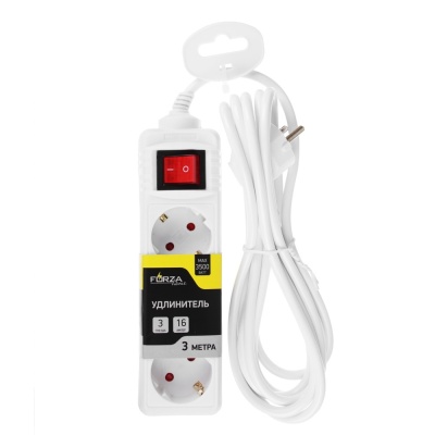 Универсальный электрический удлинитель с заземлением. Оснащен выключателем. Предназначен для нестационарного подключения потребителей к электрической сети переменного тока, на 3 евророзетки, с максимальной мощностью 3500Вт, длина шнура 3 метра.