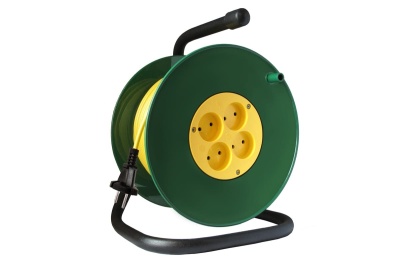 Катушка расположена на стальной стойке и обладает ручкой для удержания и переноски удлинителя по рабочей площадке.