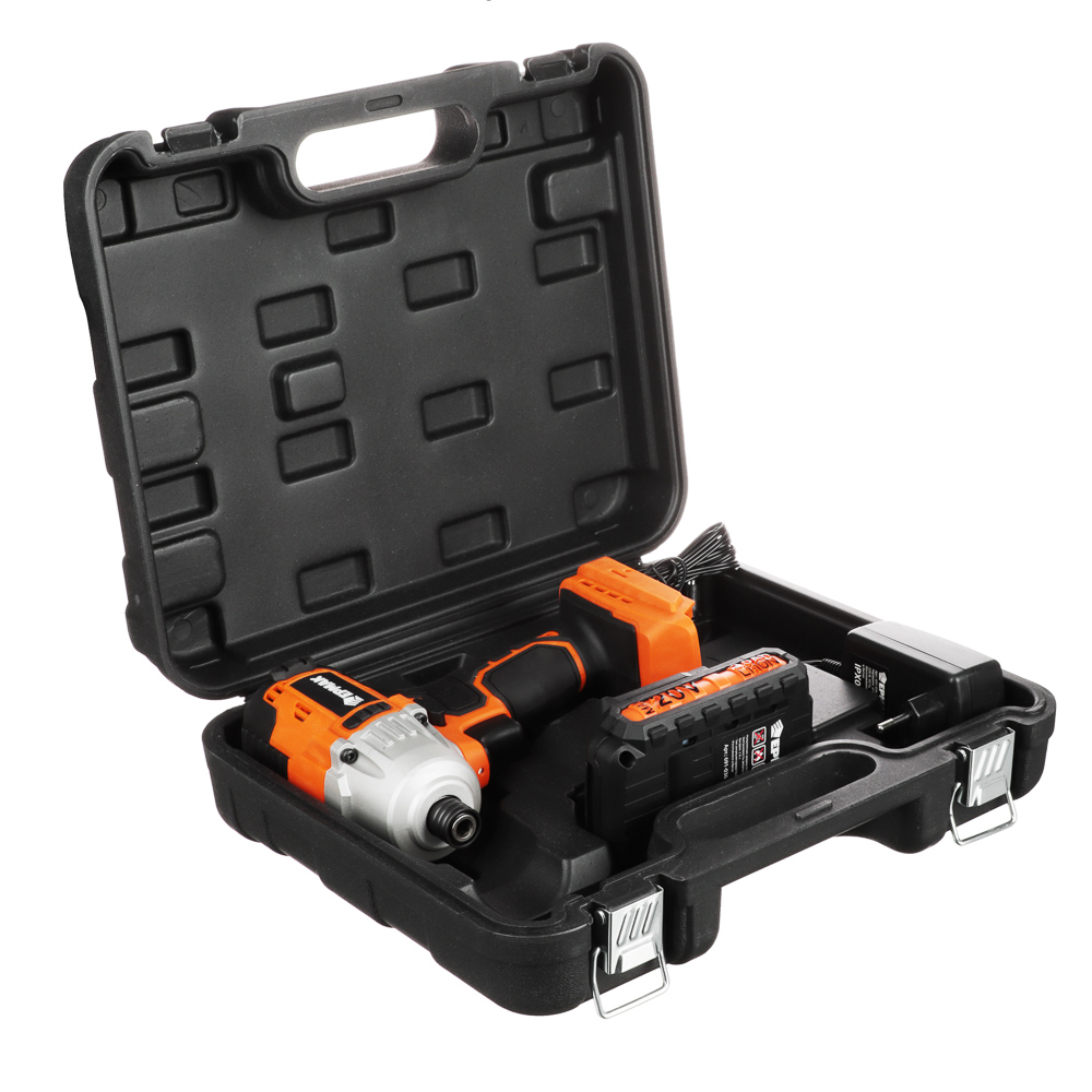 Ударный бесщеточный аккумуляторный винтоверт ЕРМАК X-PRO «Импакт» – это компактный ручной электроинструмент для монтажа и демонтажа различных конструкций, который характеризуется высокой автономностью и отличной производительностью. Величина момента – 200 нм. Патрон – 1/4, скорость вращения – 0-2500 об/мин. Предусмотрена функция реверса, а также яркая LED-подсветка, что позволяет работать при отсутствии электричества. Аккумуляторная батарея Li-ON 20В, 2, 0 А*ч характеризуется надежной и стабильной работой, совместима с любым электроинструментом из аккумуляторной серии ЕРМАК и полностью заряжается за 1,5 часа. Комплектуется жестким пластиковым кейсом для хранения и транспортировки.