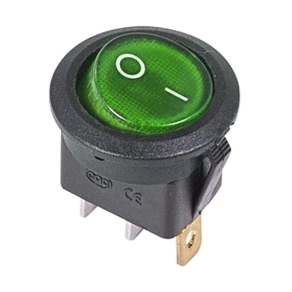 Круглый двухпозиционный клавишный выключатель 12 Вольт Рексант с зеленой индикацией, 3 контакта 20 Ампер 36-2588