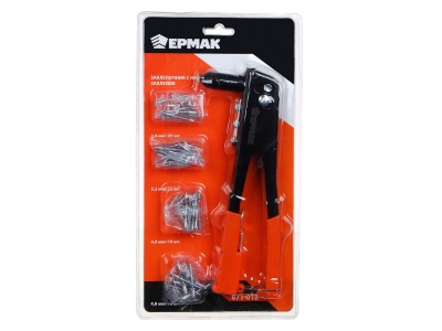 Заклепочник 225 мм в комплекте с набором заклепок 2,4 / 3,2 / 4,0 / 4,8 мм. 4 сменные насадки, 60 заклепок в наборе. Все необходимое для работы. ЕРМАК.