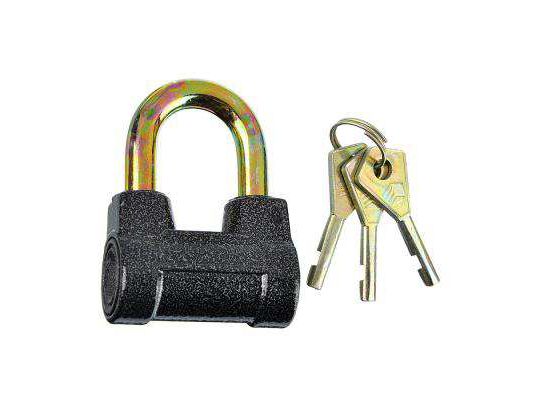 Сложная конструкция изделия повышает стойкость к взлому, а стальная дужка снижает вероятность её распила. Корпус выполнен из прочного алюминиевого сплава, с нанесением полимерного покрытия, это гарантирует долгий срок службы. Замок имеет цилиндровый тип механизма секретности и запирается при помощи ключа.